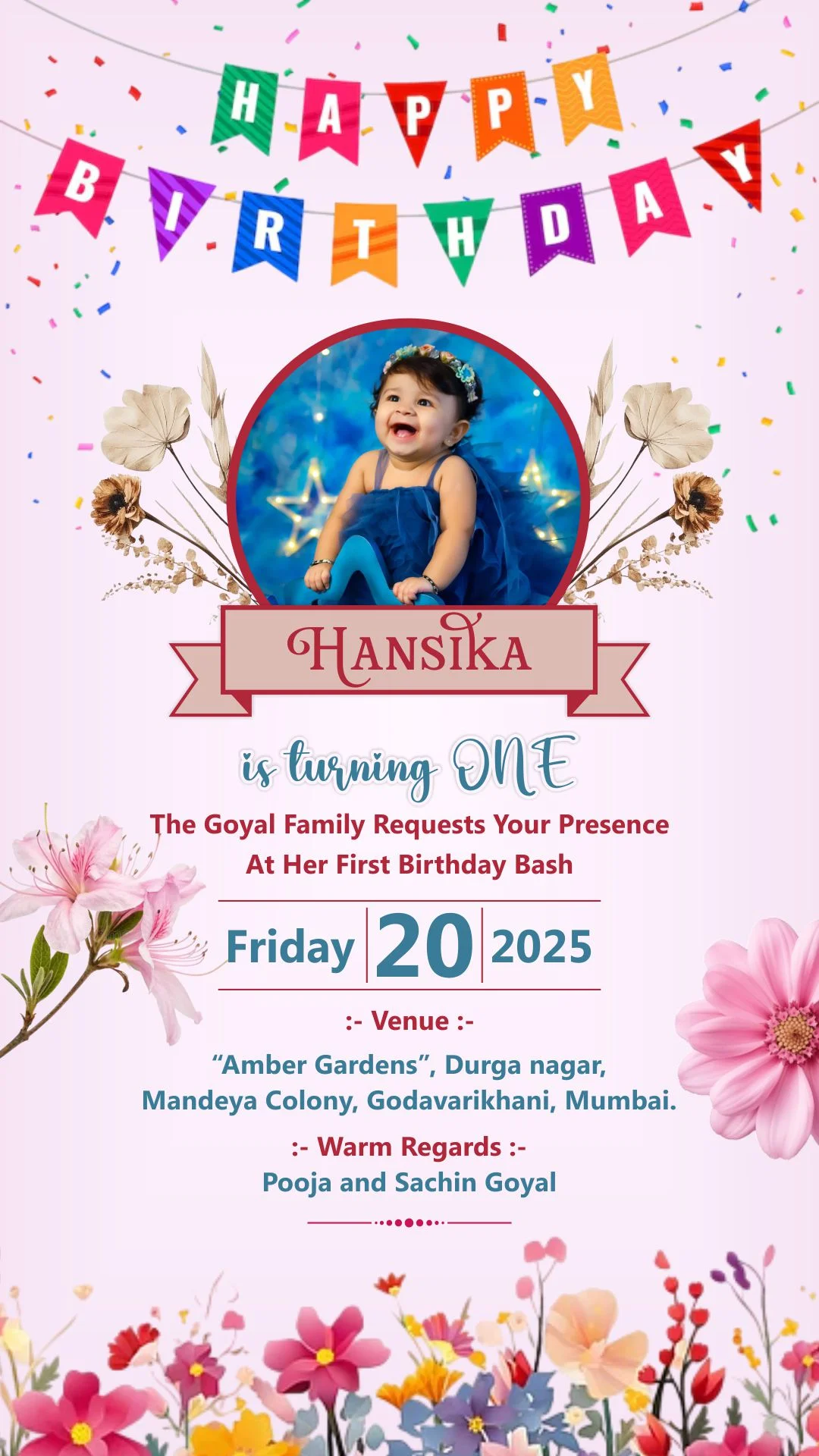This vibrant and joyfully designed digital birthday invitation beautifully captures the essence of a child's first milestone celebration. Set against a backdrop of cheerful colors and floral accents, the card radiates warmth, innocence, and festivity. A charming photograph takes center stage, framed by whimsical decorations and playful confetti that symbolize happiness and new beginnings. The layout balances elegance with fun through thoughtful typography and gentle pastel tones, while celebratory motifs like banners and blossoms enhance the overall appeal. This invitation is a heartfelt expression of love, marking a special day with grace, delight, and unforgettable memories.