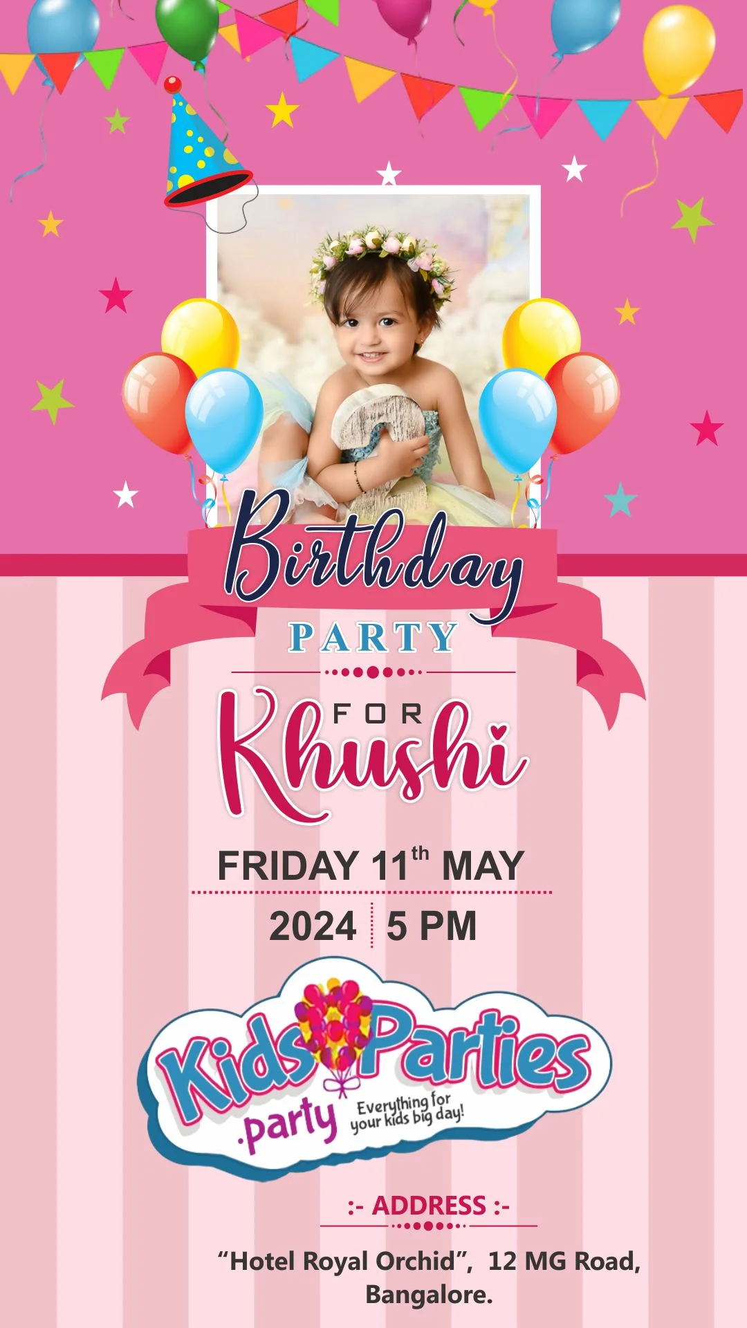 This cheerful and delightfully vibrant digital birthday invitation is a heartwarming celebration of childhood joy and innocence. Set against a lively pink backdrop adorned with balloons, stars, and colorful buntings, the design radiates playful energy and happiness. The centerpiece features an adorable portrait that adds a personal and affectionate touch, while the overall composition is enhanced with party-themed graphics and pastel tones. The use of fun fonts, festive elements, and an inviting layout makes this card perfect for a memorable kids’ celebration, capturing the spirit of laughter, love, and magical moments in the most endearing way.