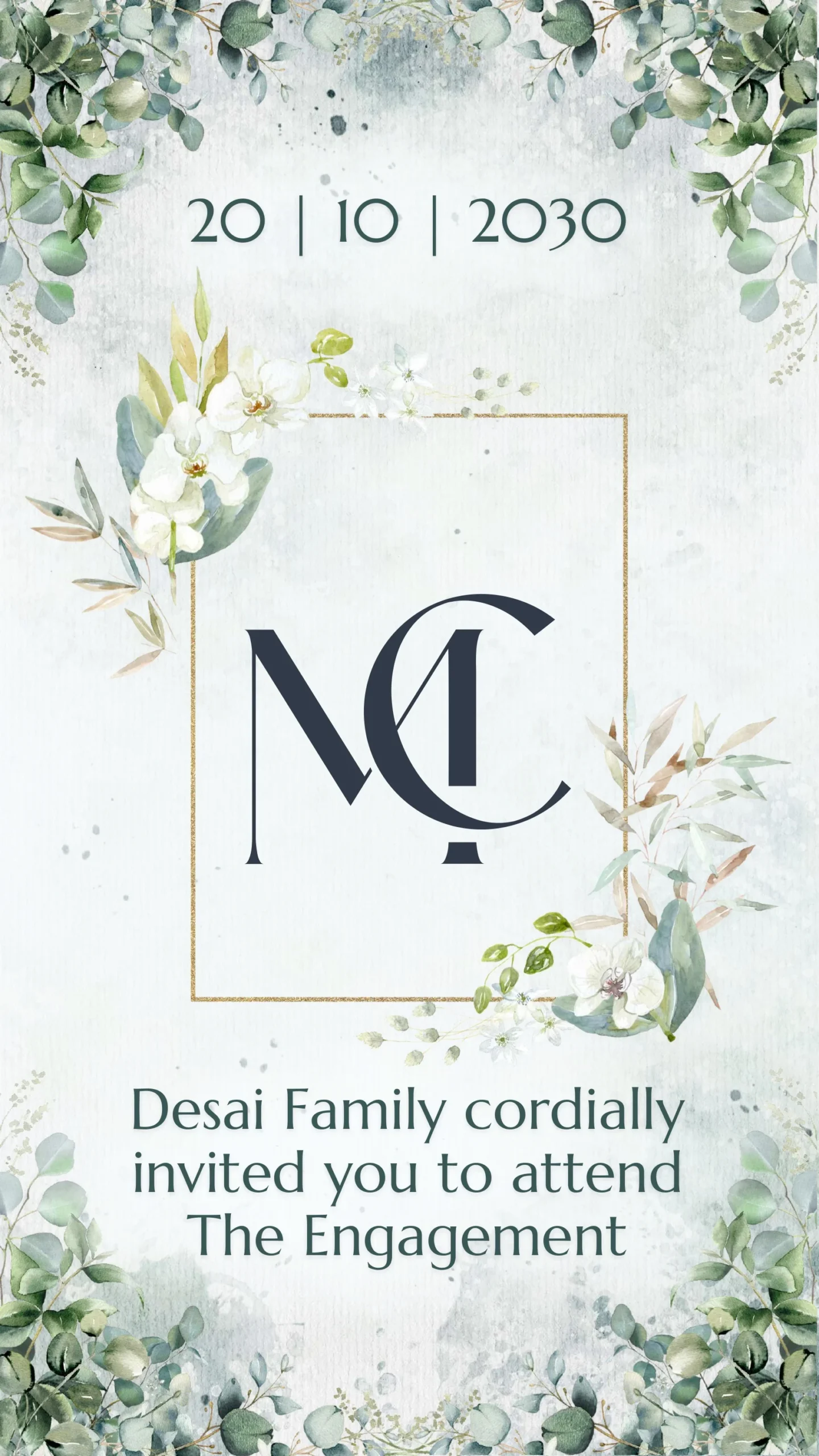 This elegant engagement invitation card features a soft botanical theme with delicate greenery and white floral accents, perfectly blending modern sophistication with timeless charm. The design showcases a minimalist background in subtle watercolor textures, highlighted by a stylish golden frame that adds a touch of luxury.