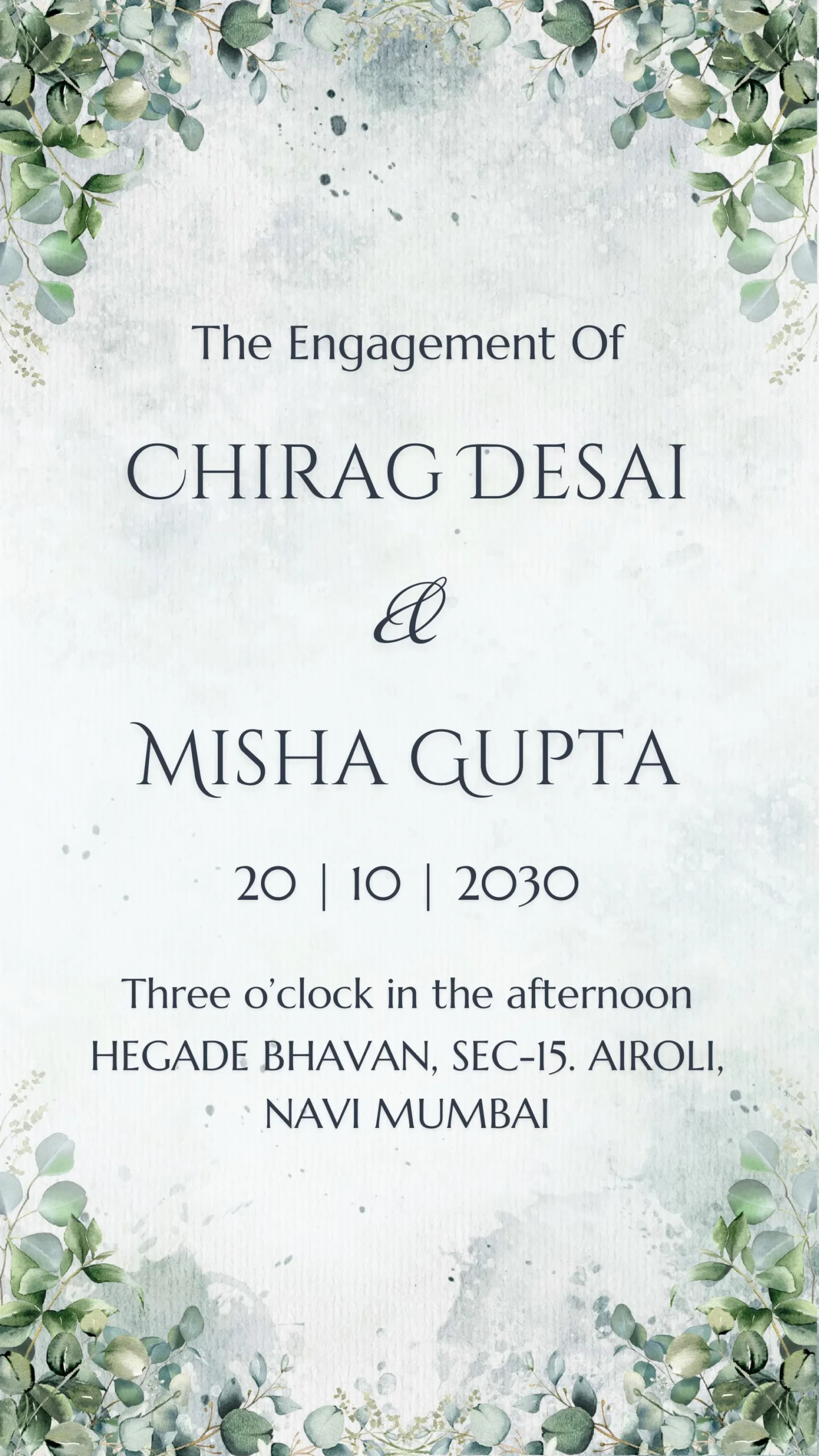 Ideal for digital or printed sharing, this e-invite is crafted in English and features a neutral, versatile design suitable for a wide audience. The combination of leafy greenery, white orchids, and soft florals creates a romantic and graceful atmosphere, reflecting the joyous occasion. Perfect for engagement or ring ceremonies, this card balances modern simplicity with classic elegance, making it a refined choice for contemporary Indian celebrations.