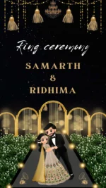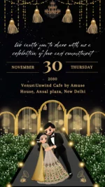 This elegant engagement invitation card showcases a charming illustration of a couple in formal attire, set on a beautifully decorated pathway framed by lush greenery and delicate hanging lights. The design blends deep black and gold tones, creating a sophisticated and luxurious ambiance perfect for a romantic celebration. Golden chandeliers and ornamental tassels add a regal touch to the evening-themed background, enhancing the card’s grandeur. The overall aesthetic balances modern minimalism with traditional elegance, making it a versatile choice for ring ceremonies and engagement events. Crafted digitally for easy sharing, this invite beautifully captures the essence of love, commitment, and celebration with its warm, inviting glow and graceful design elements.