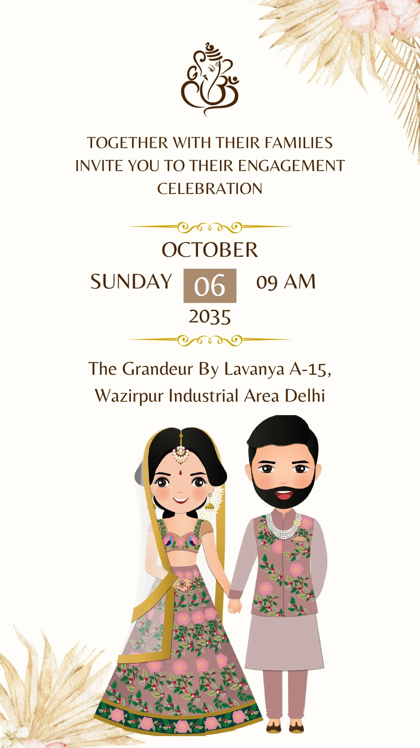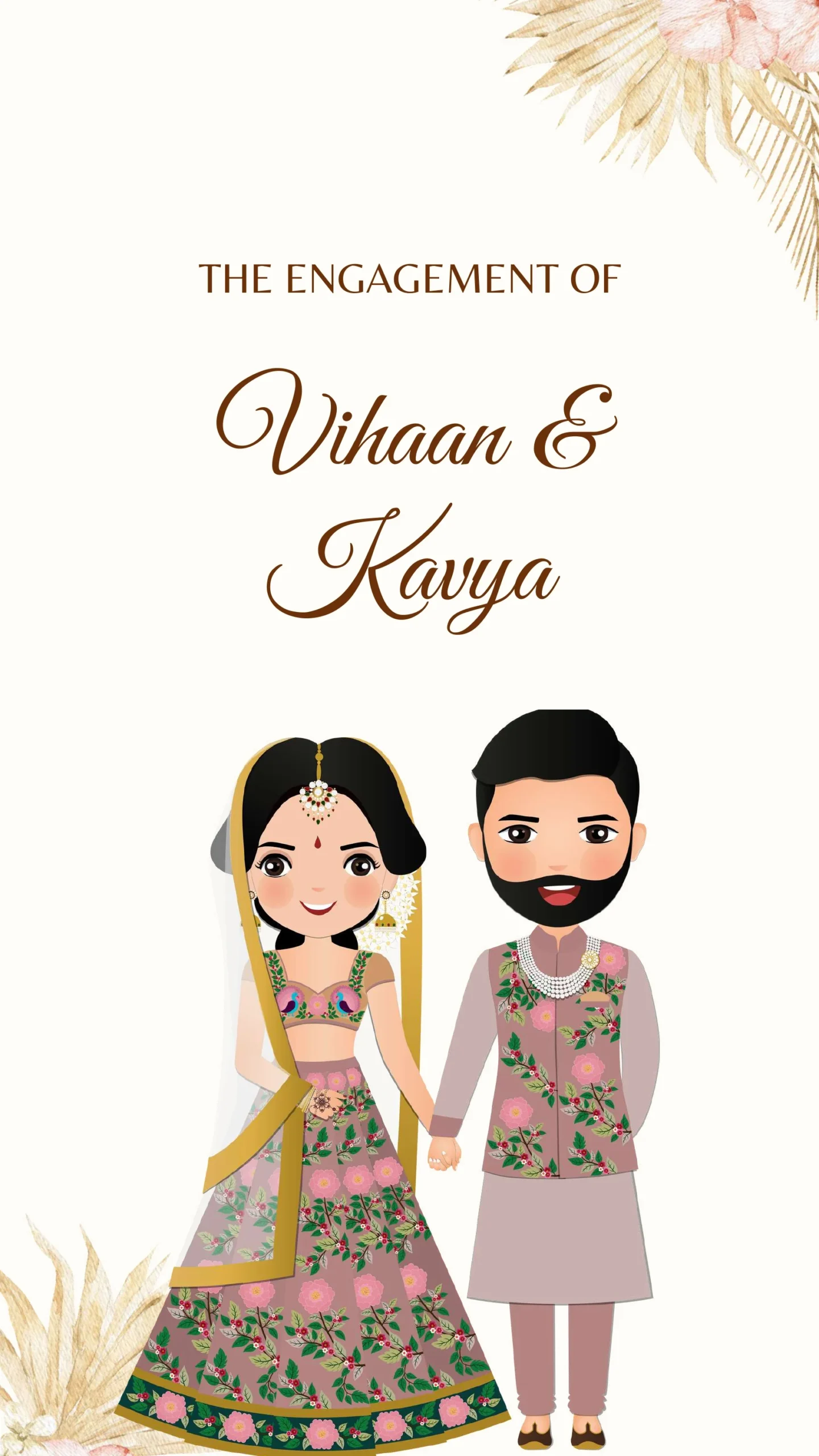 This elegant digital invitation card for an engagement celebration showcases a charming illustration of a couple in traditional attire, holding hands and radiating happiness. The design features a soft and warm color palette with delicate floral motifs and subtle botanical accents, creating a romantic and inviting atmosphere. The clean layout balances modern simplicity with cultural richness, making it ideal for contemporary ceremonies that honor timeless traditions. Perfect for sharing via email or social media, this invite combines a festive spirit with graceful aesthetics to set the tone for a joyous occasion.