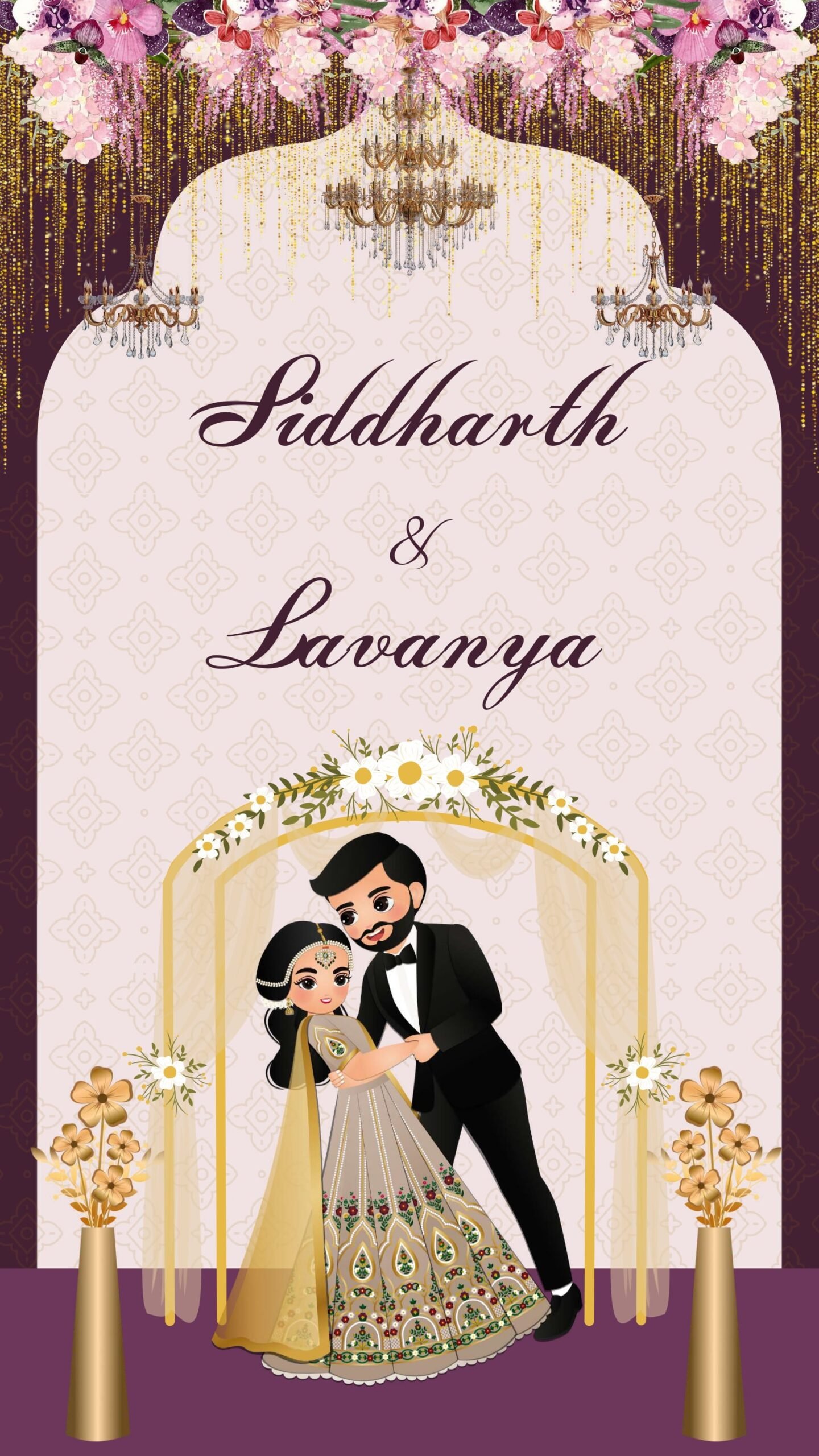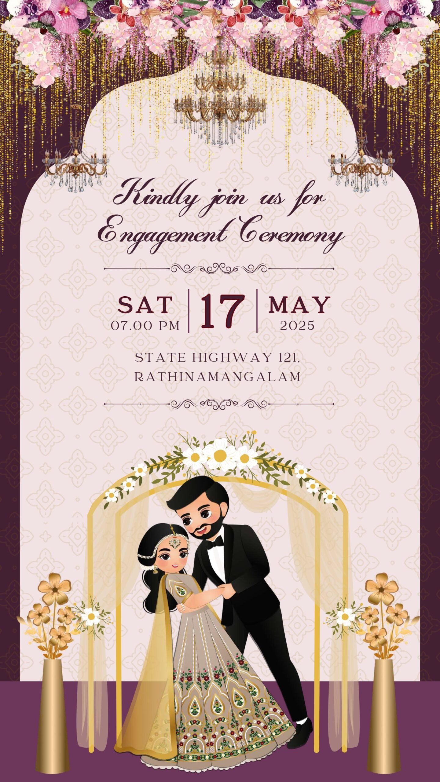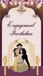 This digitally crafted engagement invitation card features a charming modern couple caricature dressed in elegant traditional attire, set against a soft beige backdrop with intricate patterns. The card combines sophistication and romance through luxurious floral accents, cascading pastel blossoms, golden chandeliers, and ornamental leaves, creating a visually captivating design.The card’s neutral tones, accented with gold highlights and minimalistic decorations, ensure universal appeal, making it perfect for digital sharing. Ideal for engagement or ring ceremonies, this e-invite balances modern aesthetics with traditional charm, offering a personalized and festive touch for your special celebration.