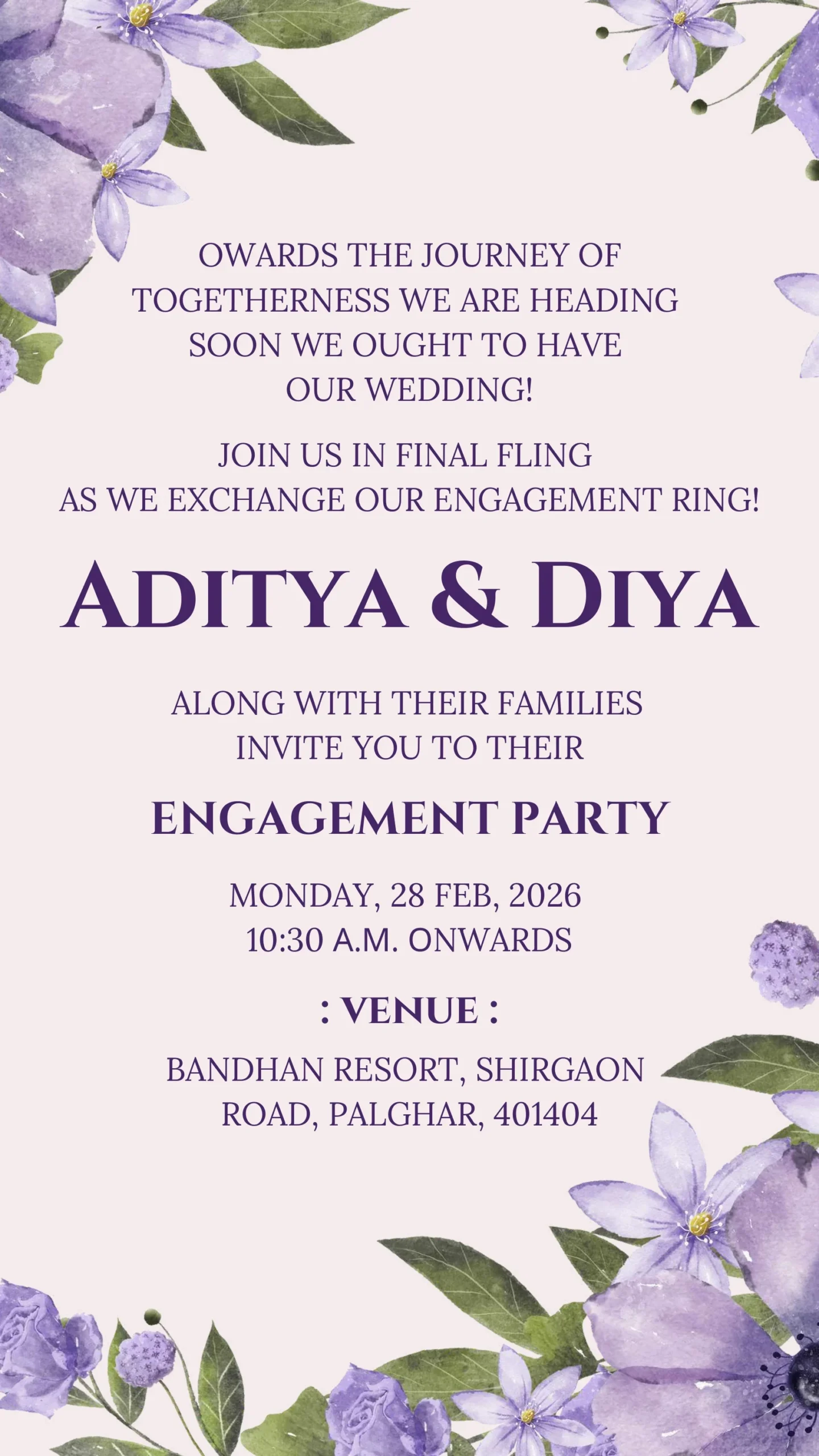 Celebrate the joyous beginning of togetherness with this elegant digital invitation for a ring ceremony. The design features a charming caricature of the couple in traditional attire, surrounded by delicate purple floral accents that symbolize love and new beginnings. This invitation perfectly blends tradition and modern style, creating a warm and inviting feel for all guests. Join family and friends as they come together to honor this special moment and share in the happiness of the engagement celebration.