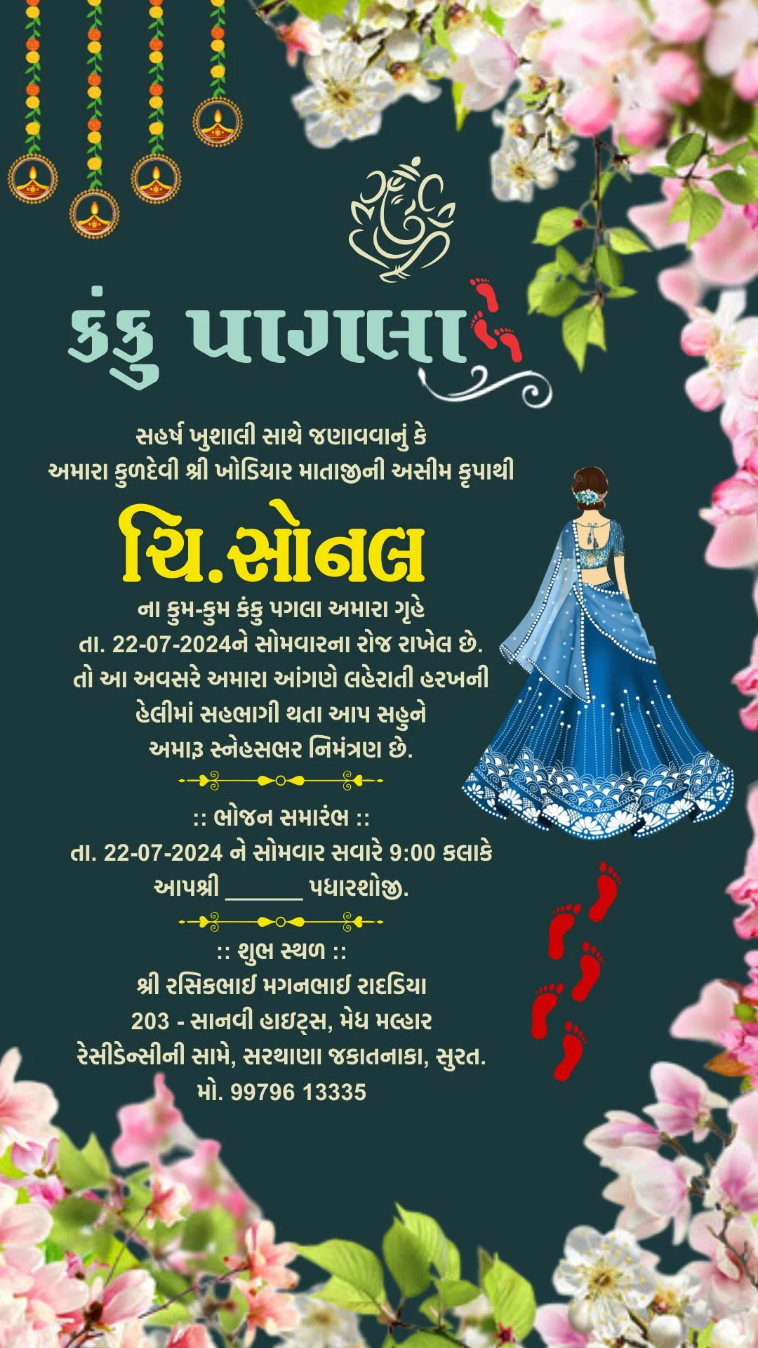 Kanku pagla invitation card in gujarati language with floral borders, glowing lanterns & sacred red footprints 120003