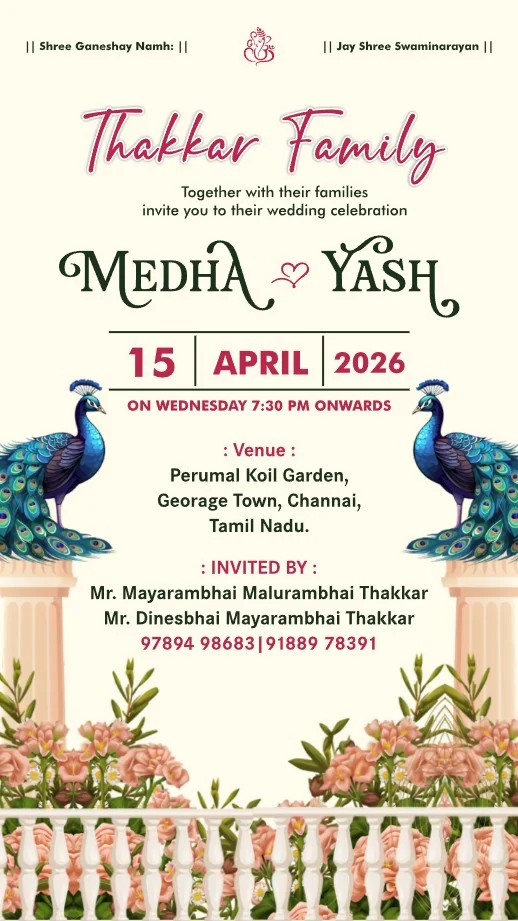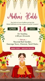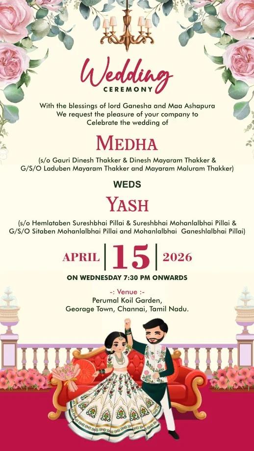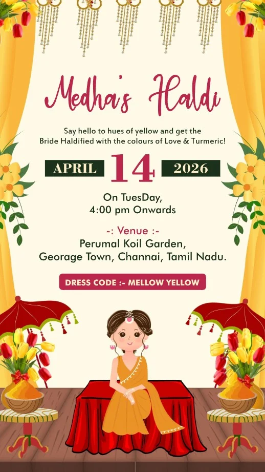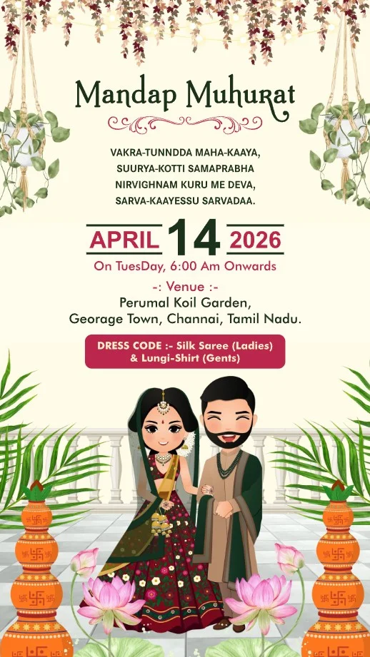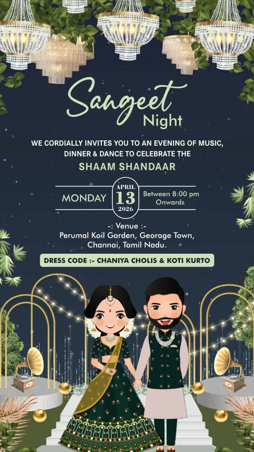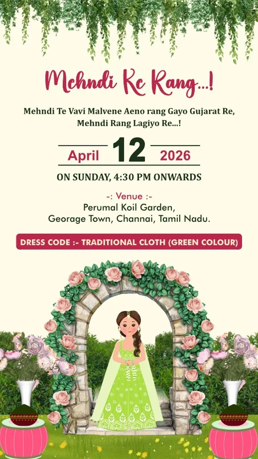This captivating digital wedding invitation is a celebration of love and culture, woven with rich tradition and contemporary charm. Featuring artistic depictions of each wedding ritual, the design showcases vibrant themes with exquisite floral arrangements, traditional attire, and festive elements like lanterns, peacocks, and lush greenery. Each event—from colorful pre-wedding festivities to the graceful ceremony—is thoughtfully illustrated, evoking joy, togetherness, and spiritual warmth. The coordinated dress codes and elegant settings add a sense of unity and excitement, creating a heartfelt invitation experience that reflects the grandeur and intimacy of this cherished journey.