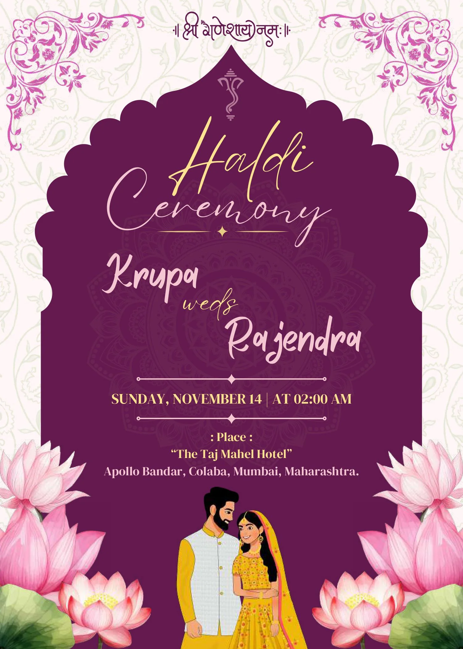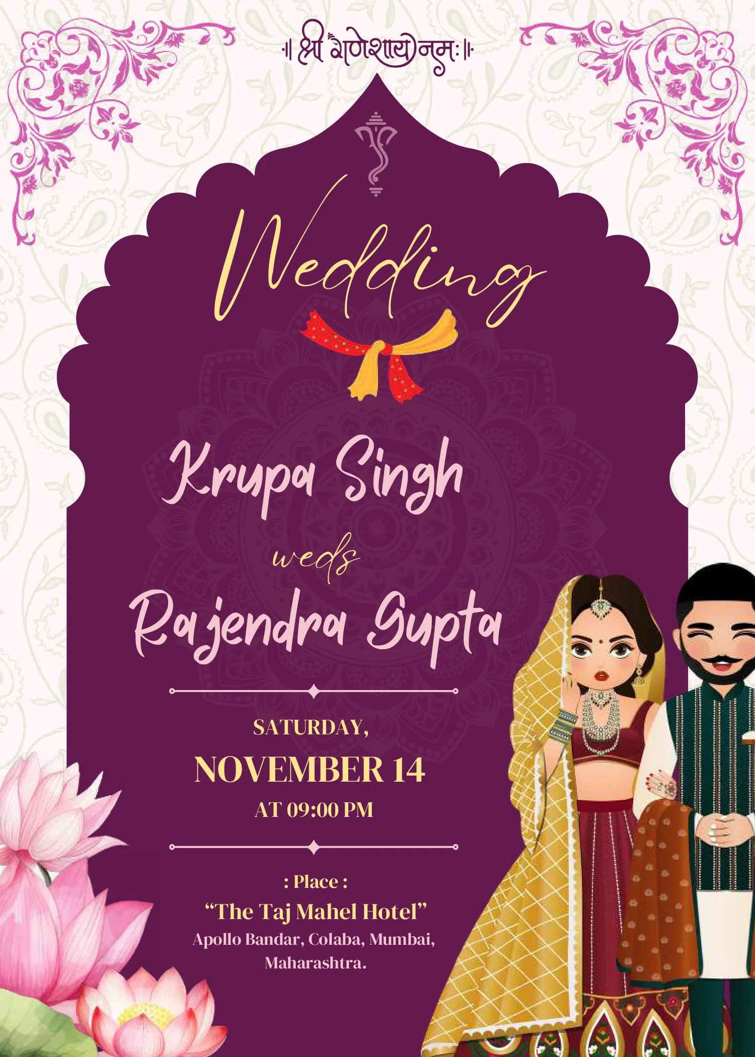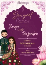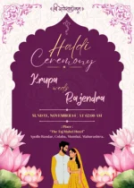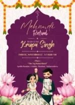 This beautifully crafted digital wedding invitation suite captures the spirit of a grand Indian celebration through its rich cultural aesthetics and vibrant illustrations. Designed with an elegant palette of royal purples and soft pastels, each e-card showcases a specific pre-wedding or wedding ceremony, such as the Haldi, Mehandi, Sangeet, Mandap ritual, and the main wedding event. Adorned with blooming lotus flowers, traditional garlands, and cartoon-style bride and groom characters in festive attire, the cards radiate warmth and joy. The mandala motifs, ornate patterns, and intricate borders evoke timeless tradition while offering a modern, shareable design perfect for social media and messaging apps. Ideal for couples seeking a stylish and cohesive digital invite experience, this set combines cultural symbolism with contemporary flair, making every celebration moment unforgettable.