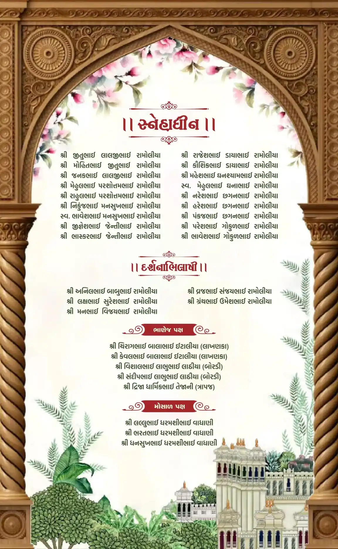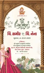 Be the first to review “Wedding ceremony invitation card in gujarati language with camels, wedding doodles, tree, peacock, leaves & flowers 110047”