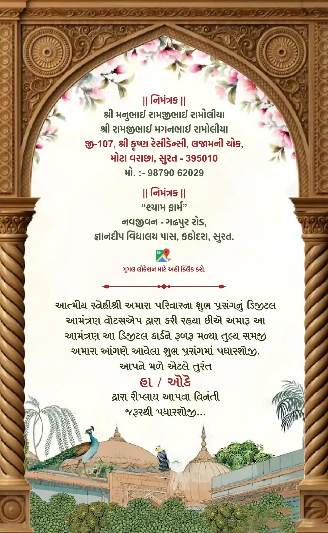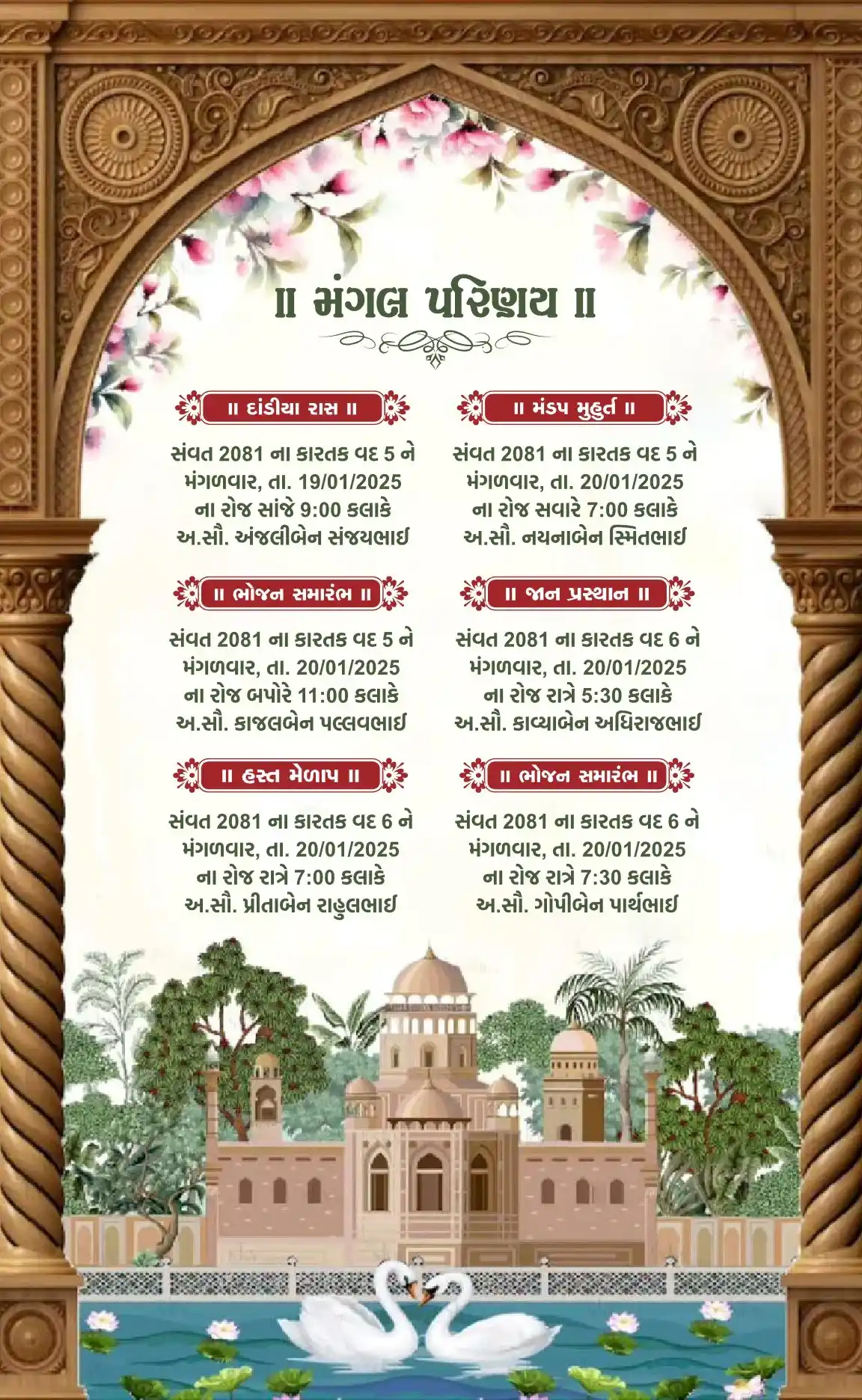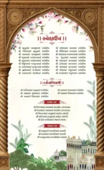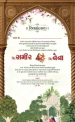 This beautifully designed digital wedding invitation reflects the grandeur of Indian culture through its intricate visuals and traditional charm. Each page is adorned with ornate arches, delicate floral borders, and artistic depictions of festive elements like peacocks, swans, camels, and royal attire. The invitation narrates the wedding journey with grace—featuring ceremonial events, heartfelt messages, and family blessings—all set against a backdrop of lush gardens and heritage architecture. With its harmonious color scheme and elegant typography, this card evokes a sense of warmth, celebration, and timeless cultural richness, inviting guests into a joyous and sacred union.