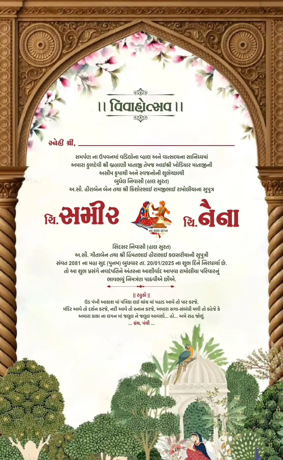 Wedding ceremony invitation card in gujarati language with camels, wedding doodles, tree, peacock, leaves & flowers 110047