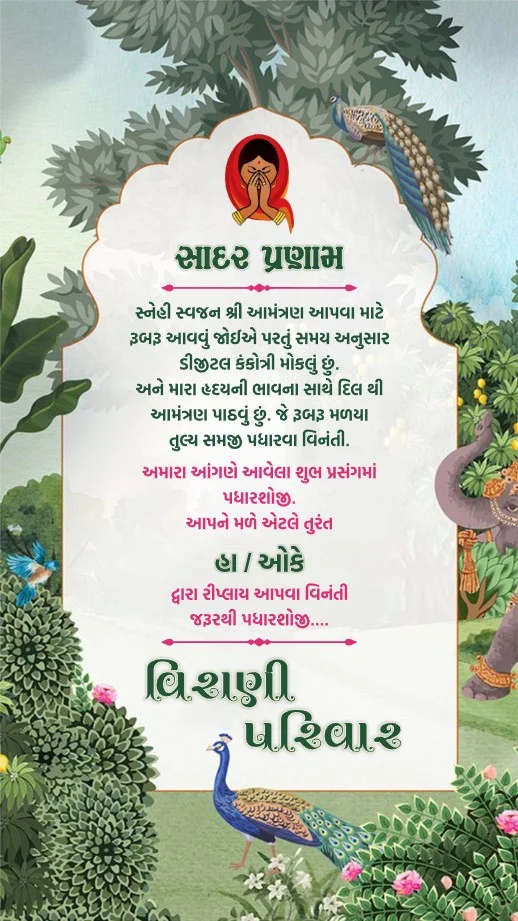 Wedding ceremony invitation card in gujarati language with couple photo, elephant, umbrella, leaves, flowers, peacock & wedding doodles 110038