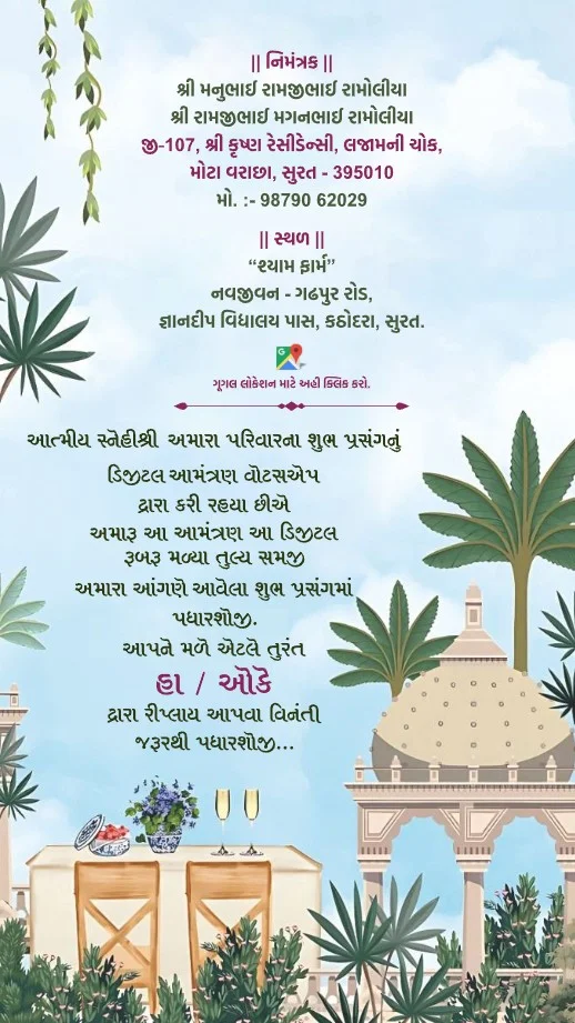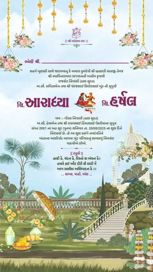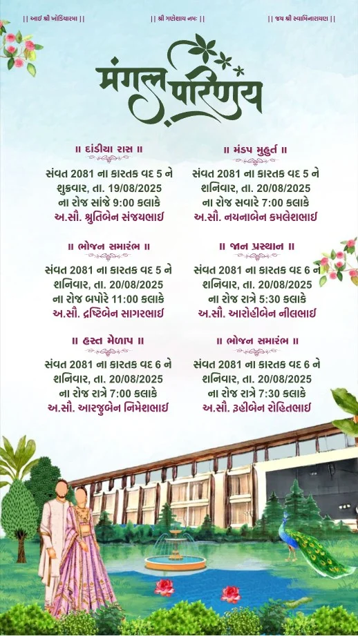 Wedding ceremony invitation card in gujarati language with couple photo, port, tree, peacock, wedding doodles & leaves 110045