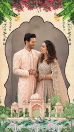 This exquisitely crafted digital wedding invitation captures the soul of traditional Indian nuptials with a modern artistic flair. Adorned with lush banana leaves, vibrant floral arrangements, golden hanging lanterns, and majestic temple motifs, it reflects the essence of cultural richness and spiritual blessings. Each section elegantly unveils the ceremonial timeline — from the joyful dance celebrations to the sacred matrimonial rituals — enhanced by romantic portraits and regal architectural backdrops. The pastel color scheme, featuring soft blush, emerald, and ivory tones, evokes grace and warmth, making this invitation a heartfelt visual journey through love, heritage, and joyous union.