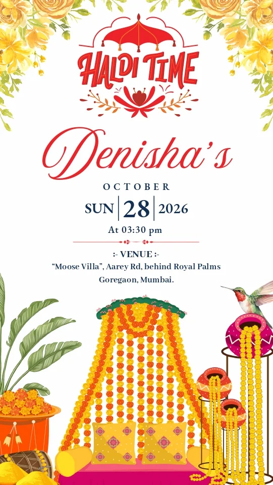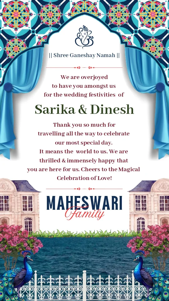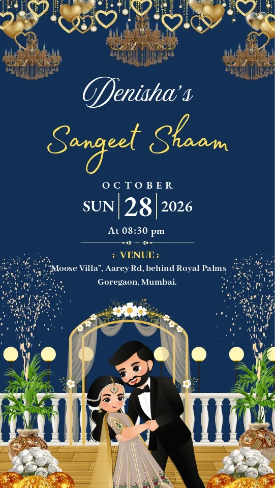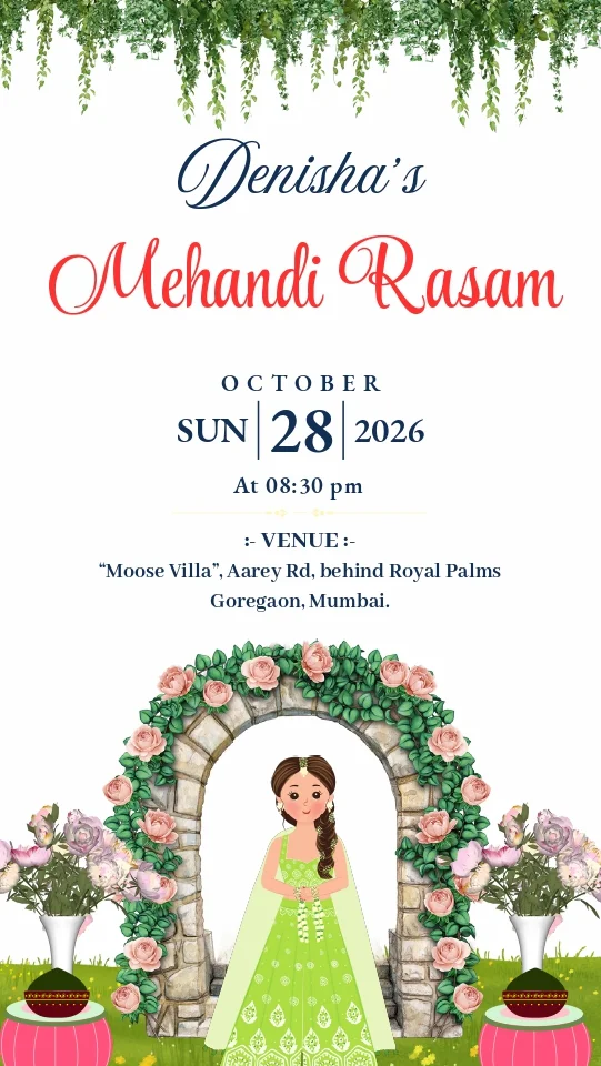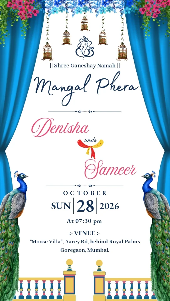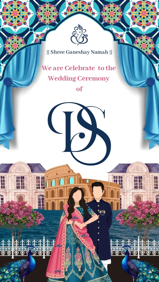 This vibrant digital wedding invitation set is designed with a luxurious Indian theme, featuring pastel tones, royal elements, and traditional motifs to reflect cultural elegance. Each e-card is tailored for a specific ceremony, including Haldi, Mehandi, Sangeet, and Mangal Phera, incorporating floral decor, peacocks, hanging lanterns, and cartoon-style bride and groom illustrations. The design highlights intricate architecture and grand backdrops, seamlessly blending heritage with modern celebration aesthetics. Perfect for sharing on social media or messaging apps, this invitation template set is ideal for couples seeking a stylish and festive way to invite loved ones to their special day.
