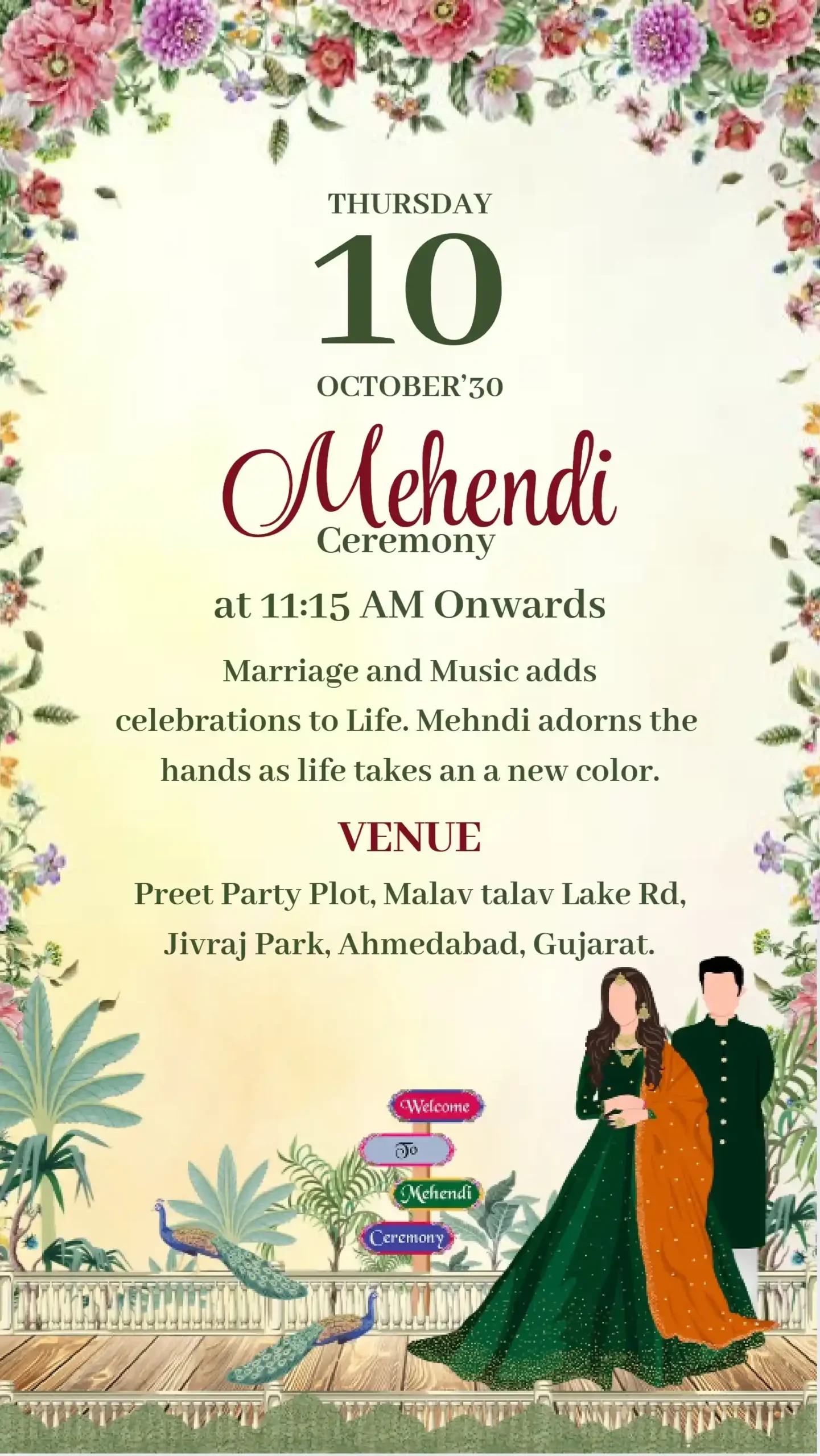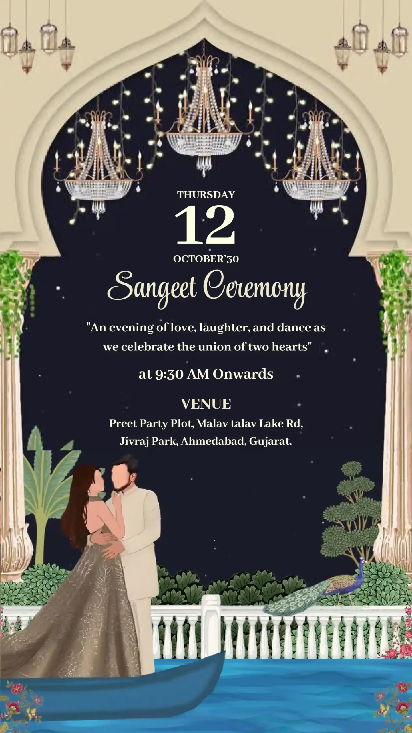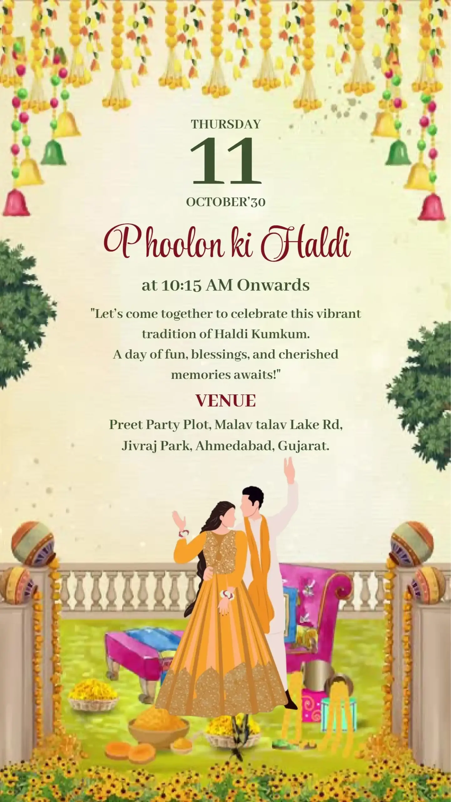 This beautifully illustrated digital wedding invitation is a charming blend of tradition and creativity, designed to reflect the vibrant essence of a culturally rich Indian wedding. The card unfolds a delightful visual narrative, showcasing each ceremonial event—from the colorful Mehendi and joyful Haldi to the spirited Sangeet and the sacred Wedding rituals—with elegantly drawn characters and intricate artistic elements. Floral garlands, traditional umbrellas, ornate chandeliers, gramophones, and lush greenery enrich the backdrop, adding a touch of nostalgia and grandeur. Every detail, from festive attire to symbolic décor, has been thoughtfully curated to evoke warmth, celebration, and heritage. With its seamless flow and aesthetic charm, this invitation captures the heart of a multi-day wedding celebration, blending modern elegance with timeless cultural values for a meaningful and memorable digital experience.