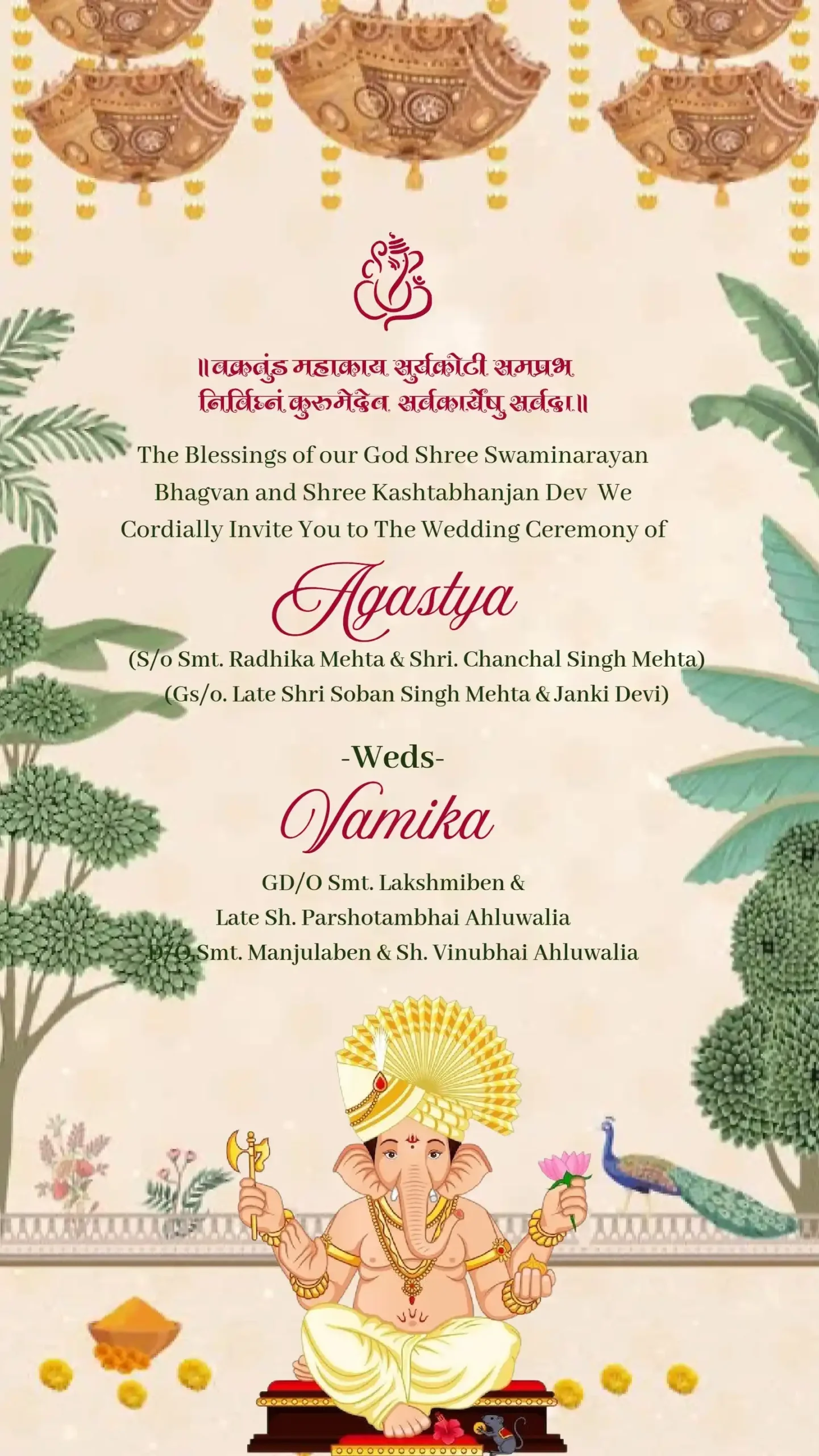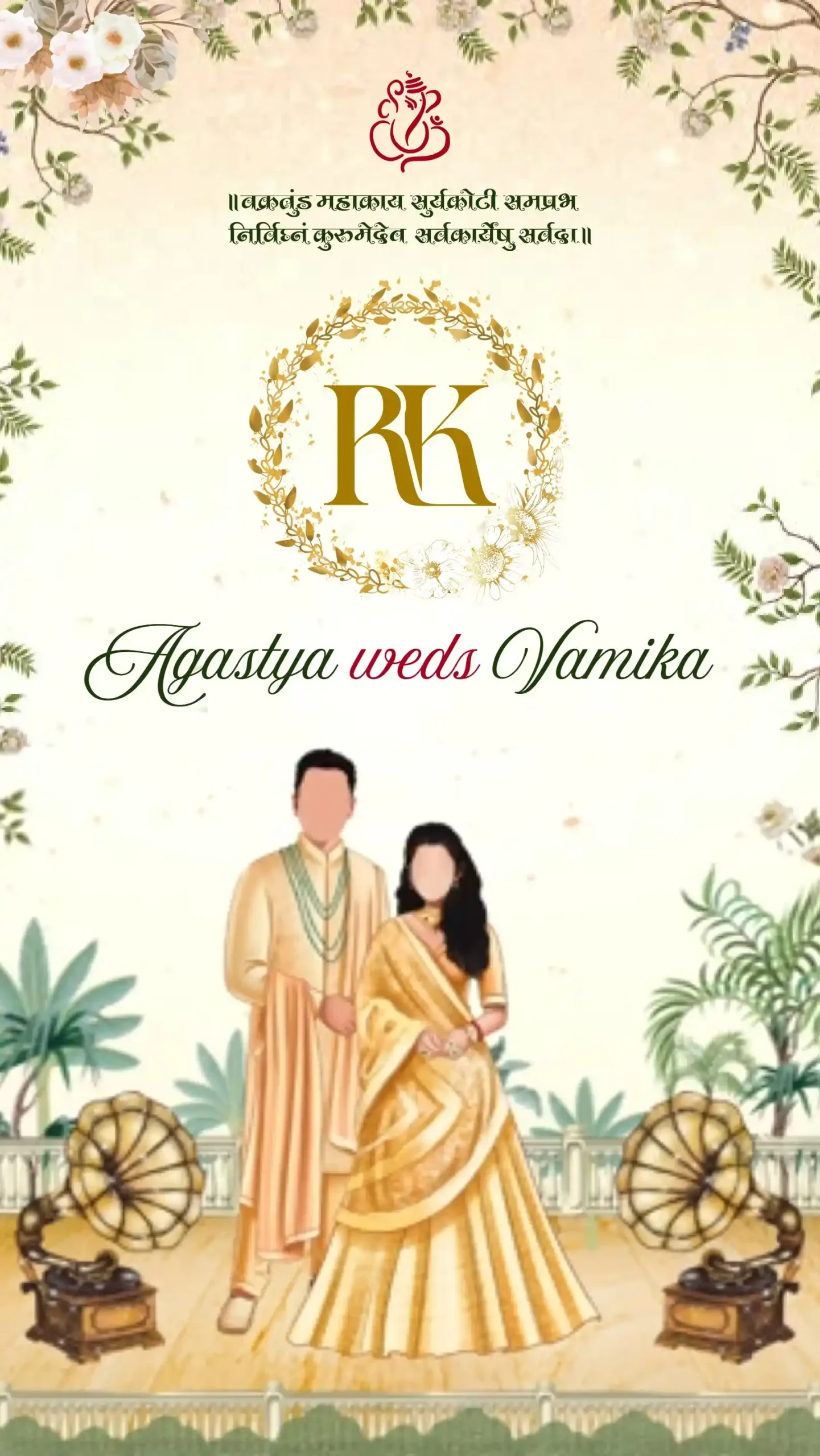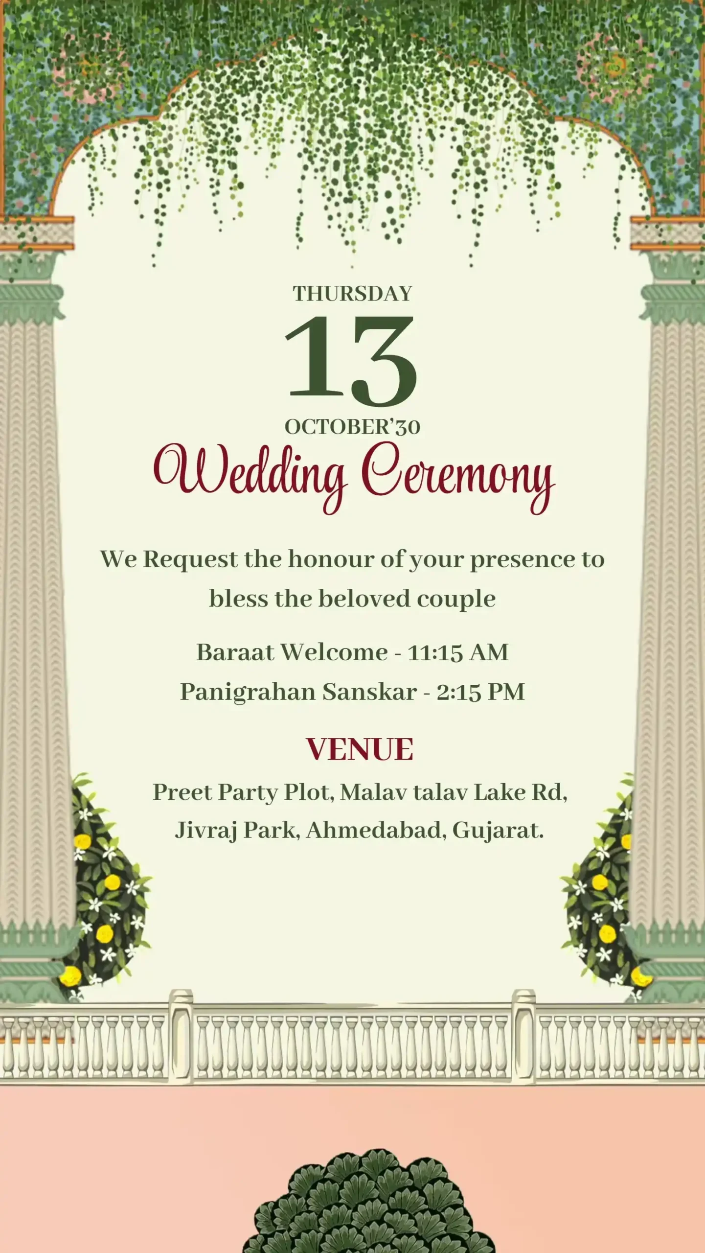 This beautifully illustrated digital wedding invitation is a charming blend of tradition and creativity, designed to reflect the vibrant essence of a culturally rich Indian wedding. The card unfolds a delightful visual narrative, showcasing each ceremonial event—from the colorful Mehendi and joyful Haldi to the spirited Sangeet and the sacred Wedding rituals—with elegantly drawn characters and intricate artistic elements. Floral garlands, traditional umbrellas, ornate chandeliers, gramophones, and lush greenery enrich the backdrop, adding a touch of nostalgia and grandeur. Every detail, from festive attire to symbolic décor, has been thoughtfully curated to evoke warmth, celebration, and heritage. With its seamless flow and aesthetic charm, this invitation captures the heart of a multi-day wedding celebration, blending modern elegance with timeless cultural values for a meaningful and memorable digital experience.