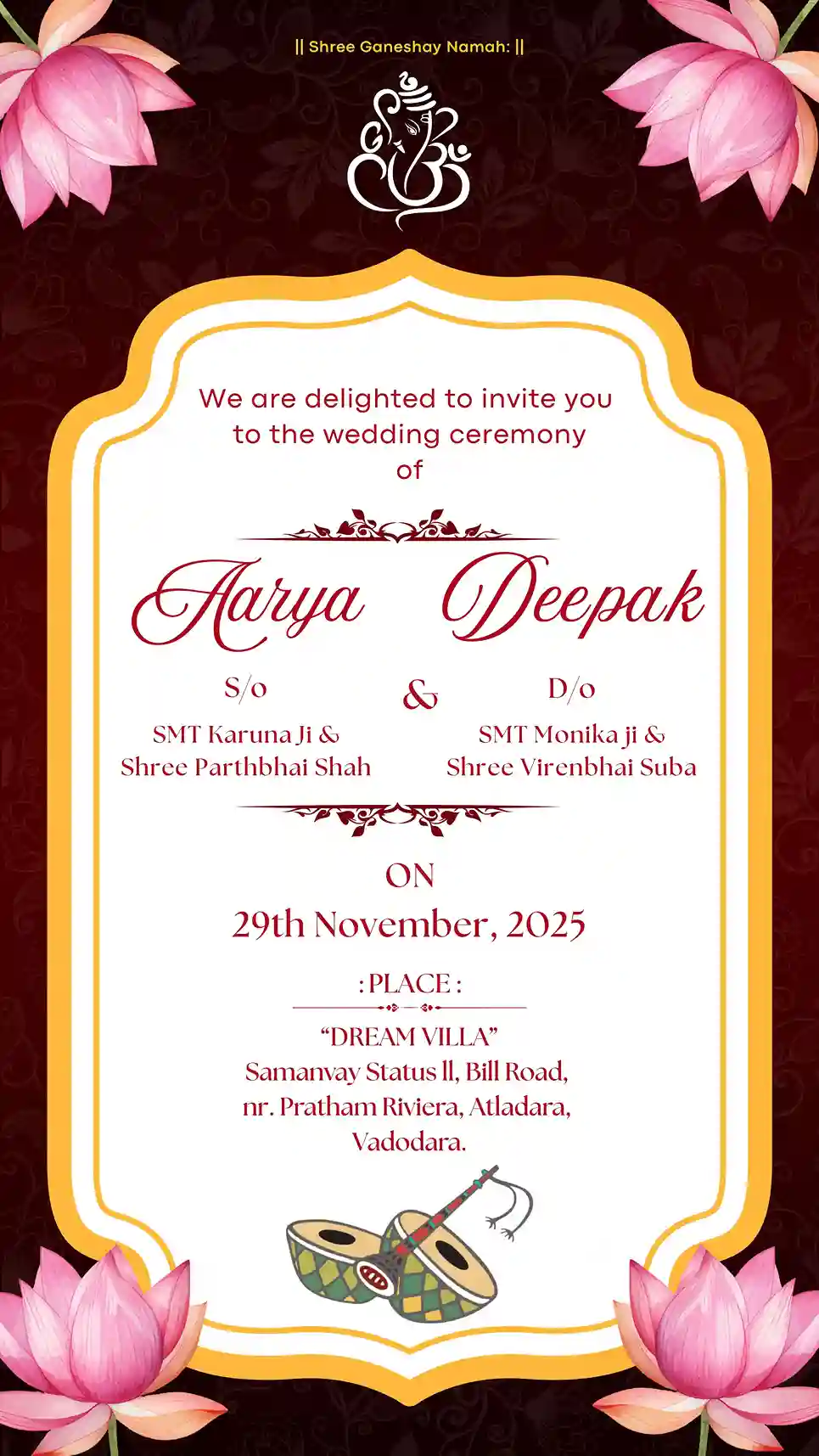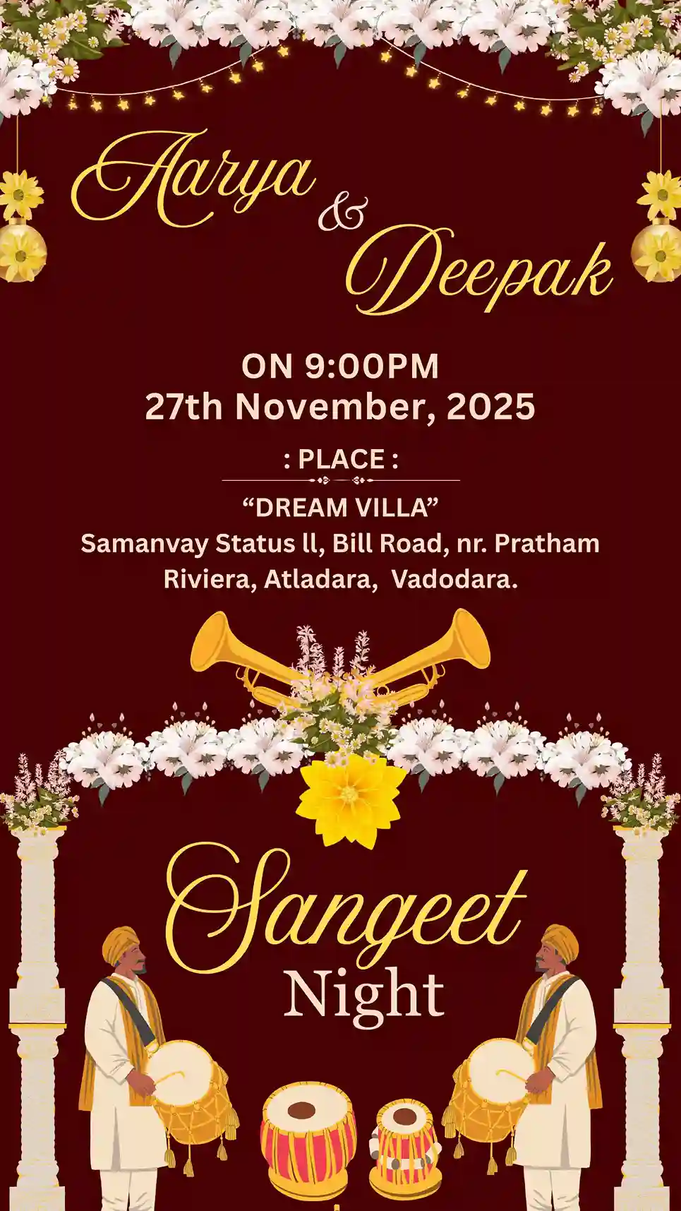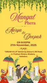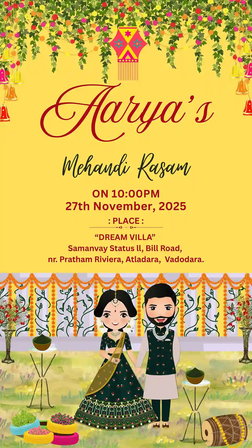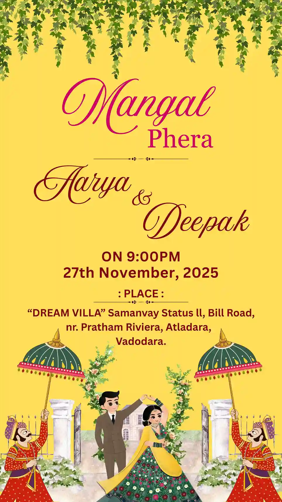 This elegant digital wedding invitation set captures the richness of Indian traditions with a blend of royal aesthetics and festive charm. Designed in a cohesive theme, each e-card represents a different ceremony, including Haldi, Mehandi, Sangeet, and Mangal Phera, using vibrant colors, floral accents, and intricate decorative elements. Traditional motifs, lotus blooms, garlands, and artistic patterns are paired with contemporary layouts, creating a perfect balance between heritage and modern design. The inclusion of illustrated characters, grand arches, and ornate backdrops adds a personalized touch, making the set ideal for sharing online and inviting loved ones in a stylish, culturally inspired way.