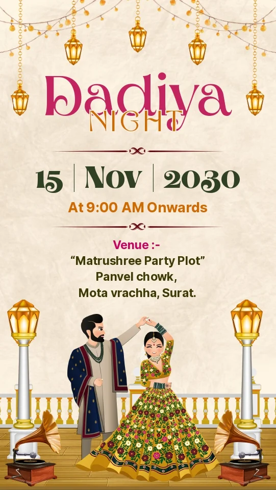 This wedding card set includes multiple event announcements such as the wedding ceremony, mehndi function, haldi ritual, and dance night celebration. Each design is enhanced with floral garlands, traditional Indian patterns, lantern illustrations, festive elements like dhols, swings, rangoli, and wedding stage motifs, giving it a complete celebration vibe.