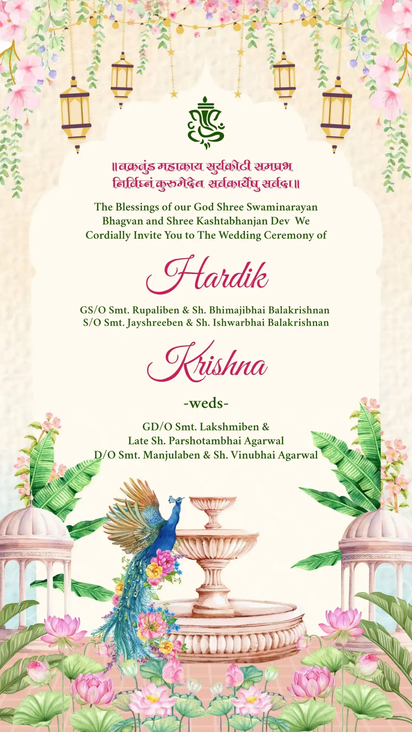 Wedding ceremony invitation card or invitation video in english language with peacock, lanterns, wedding doodles & beautiful flowers 110025